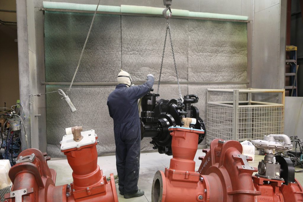 How much paint goes on a pump? Cornell Pump’s painter Steve Janz (shown in the paint booth below) says most pumps get about 32oz (about a liter) of paint. That’s on a typical 6” or 8” pump. Depending on priming and size of pump, the amount can be as high as two gallons (~7.5 liters) on pump.